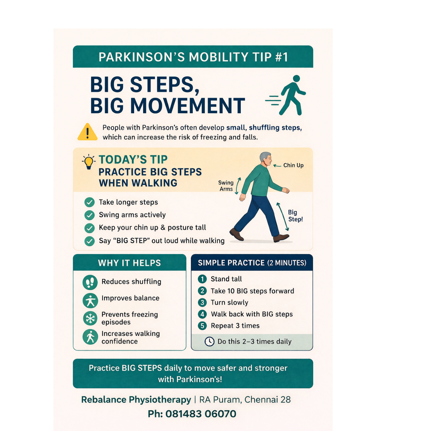 Is your loved one with Parkinson’s walking with small shuffling steps? This increases fall risk and freezing. Start with BIG STEPS training — a simple but powerful technique used in Parkinson’s rehabilitation. At Rebalance Physiotherapy, we focus on evidence-based Parkinson’s rehabilitation to improve movement and quality of life. 📍 Rebalance Physiotherapy RA Puram, Chennai 28 📞 081483 06070 #Parkinsons #ParkinsonsRehab #NeuroPhysiotherapy #ParkinsonsCare #ParkinsonsIndia #MovementDisorder #Physiotherapy #NeuroRehab #ChennaiPhysiotherapy #ParkinsonsExercise #RebalancePhysiotherapy