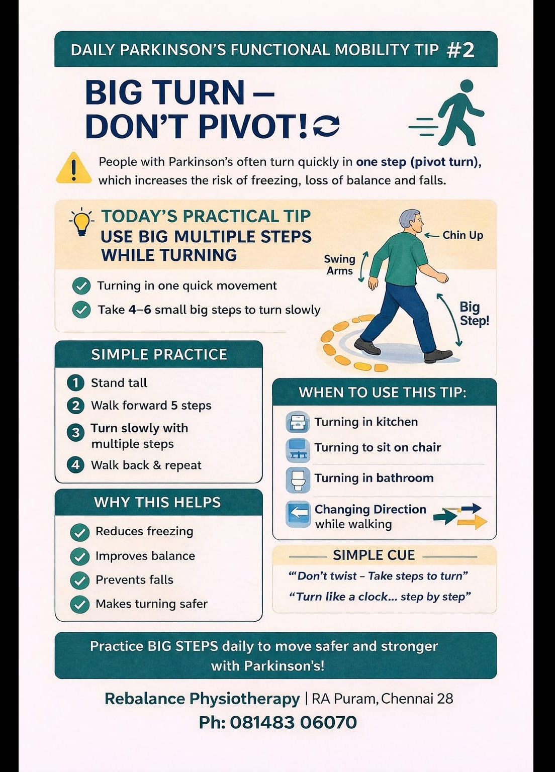 Best Parkinson's Physiotherapy in Adyar Best Parkinson's Physiotherapy in Mylapore Best Parkinson's Physiotherapy in RA Puram Best Parkinson's Physiotherapy in Thiruvanmiyur April is Parkinson’s Awareness Month 💙 Mobility Tip #2: Big Turn — Don’t Pivot Turning in one step can increase freezing and falls in Parkinson’s. Take multiple small steps to turn safely and improve balance. Small changes. Safer mobility. Better independence. 📍 Rebalance Physiotherapy, RA Puram Chennai 28 📞 081483 06070 #ParkinsonAwarenessMonth #Parkinsons #NeuroRehab #ParkinsonsCare #Physiotherapy #RebalancePhysiotherapy