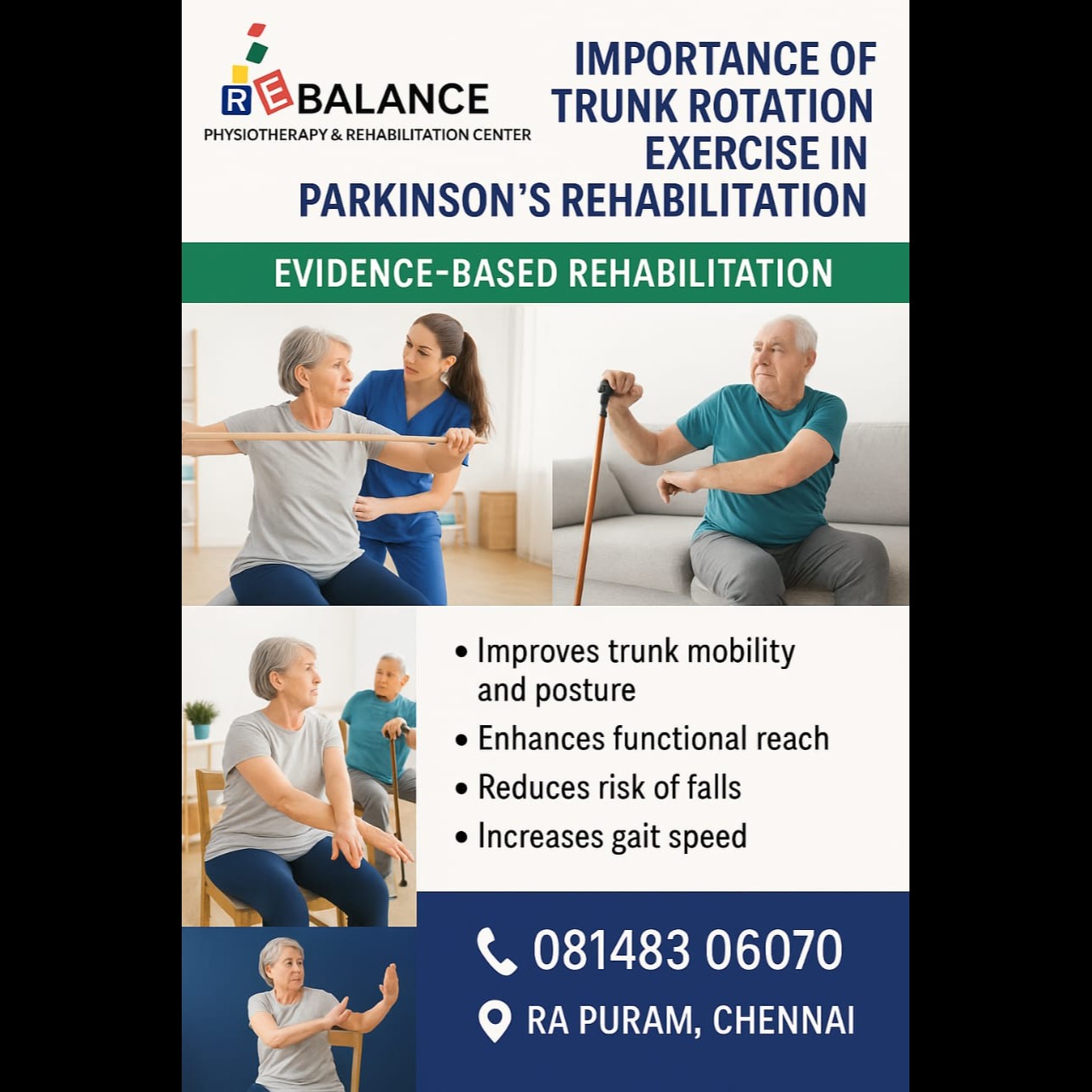 Parkinson's Physiotherapy at Rebalance Physiotherapy #Best Physiotherapy Clinic-RA Puram #Best Neurophysiotherapy-Mylapore Trunk rotation exercises play a crucial role in the rehabilitation and daily management of individuals with Parkinson’s disease (PD). 🧠 1. Improves Axial Mobility 🚶♂️ 2. Enhances Gait and Balance 🪑 3. Facilitates Functional Movements 🫀 4. Enhances Breathing and Posture 🧩 5. Supports Neuroplasticity and Motor Control